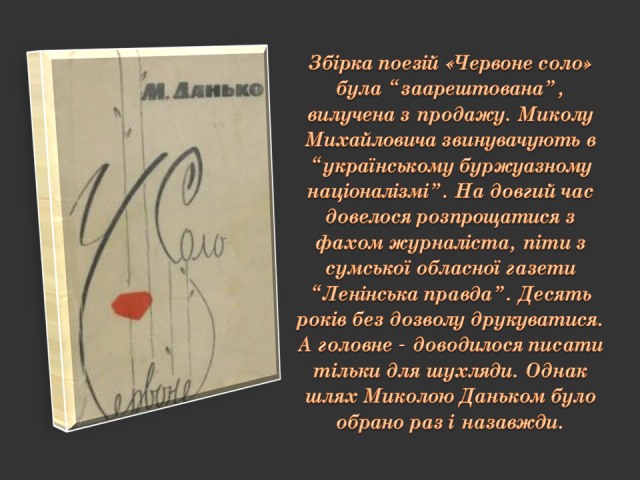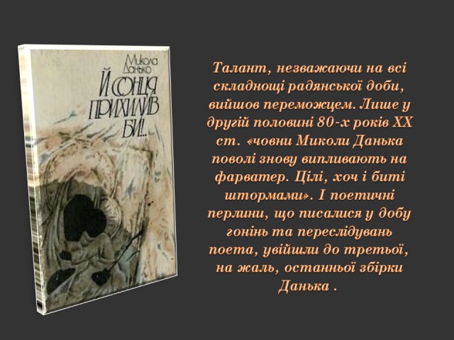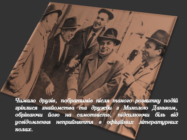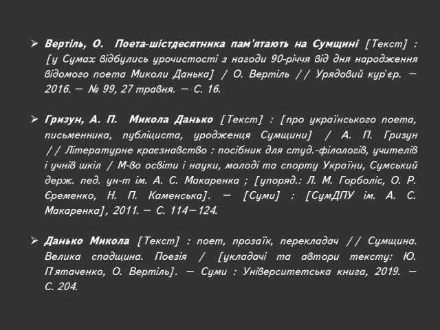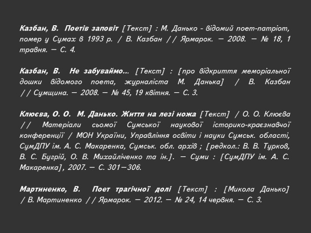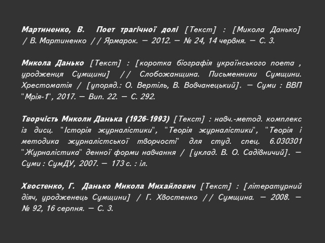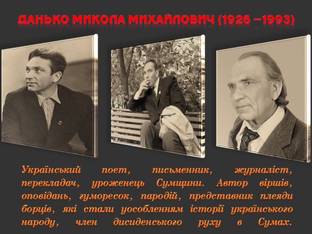 Саме до таких належить Микола Данько (1926–1993) – поет і журналіст, дисидент з плеяди літераторів «шістдесятників» Сумщини, публіцист і громадський діяч, один із лідерів українського руху опору в Сумах 1970-х – 1980-х років.