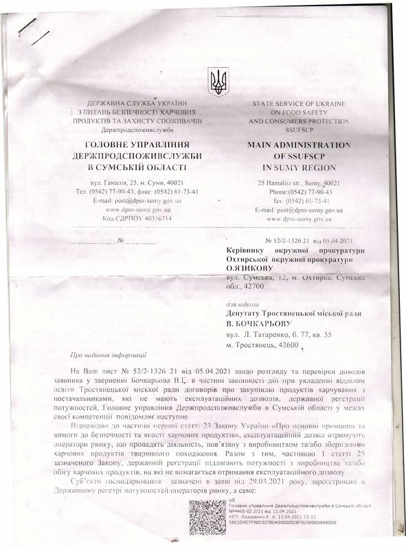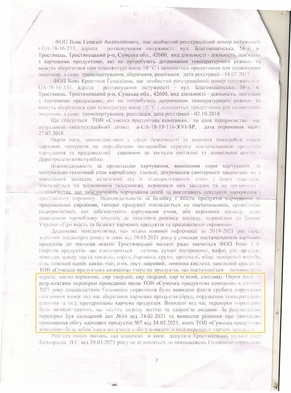 ТОВ «Сумська продуктова компанія» взагалі має припис головного управління Держпродспоживслужби у Сумській області, в якому чітко вказані порушення при постачанні продуктів харчування до закладів освіти та вимогою вилучити і знищити ці продукти. Попри такі зловживання, Тростянецька міська рада і надалі продовжує співпрацювати з постачальником.